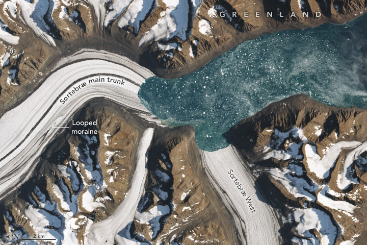 1986년과 2023년에 촬영된 두 이미지는 소르테브래(Sortebræ)와 그 지류 빙하들이 어떻게 변화했는지 보여줍니다. 1986년 이미지에서는 소르테브래(Sortebræ)가 그 지류들과 함께 하나의 흐름을 이루며, 얼음 π(파이) 기호를 닮은 독특한 모양을 만들었습니다. 2023년 이미지에서는 지류들이 그 전선을 좁히고 후퇴하여, π 모양에서 큰 "한 입"을 물어냈습니다.