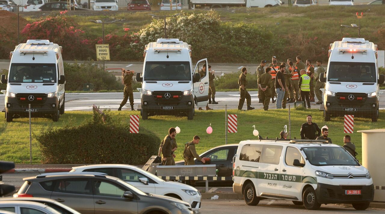 이스라엘 보안군이 2023년 11월 24일 가자에서 풀려난 인질들을 받기 위해 준비하면서 텔아비브 슈나이더 의료 센터 헬기장 밖에 대기 중인 구급차 옆에 서 있습니다. (Fadel Senna/AFP via Getty Images)